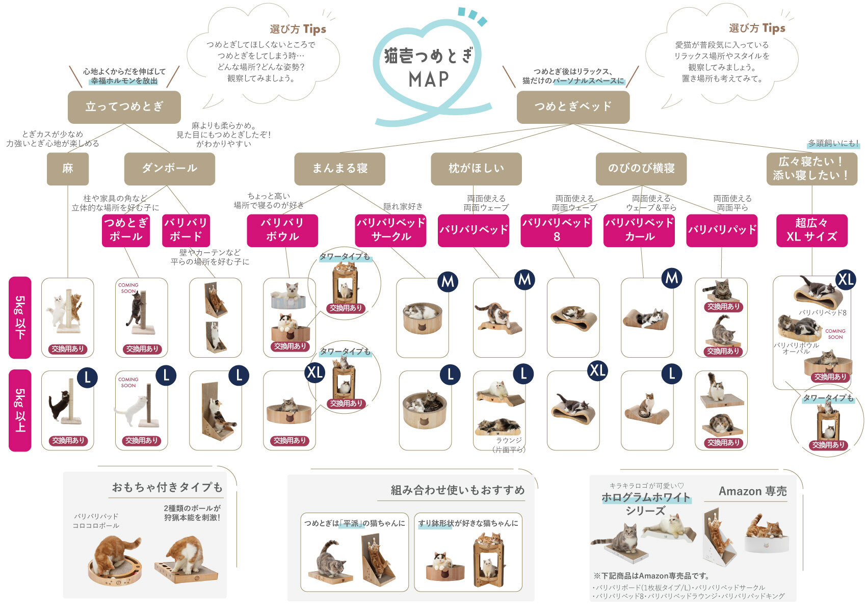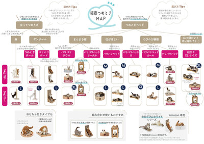 猫それぞれのつめとぎスタイルの好みや、猫のからだのサイズに合わせて、お気に入りの1品に出会えるように、約90種類のラインナップを揃えています。