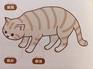 ネコの肩こりをほぐすツボは3つあります。イラストを参考にして場所を覚えて下さいね。
