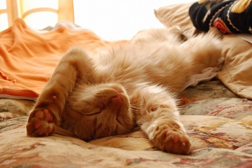 人間も猫も眠るときは体温が高くなるので、同じ布団に一緒にくるまっていると、本当に湯タンポが布団に入っているのかと思うくらいポカポカになります。