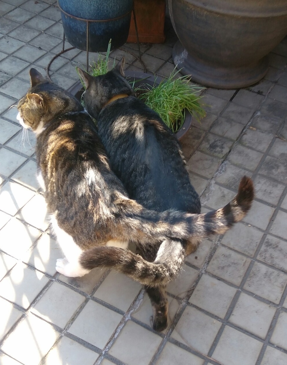 我が家のミクシーとムネシロウ(まるで肩を組んでいるようなしっぽ)
