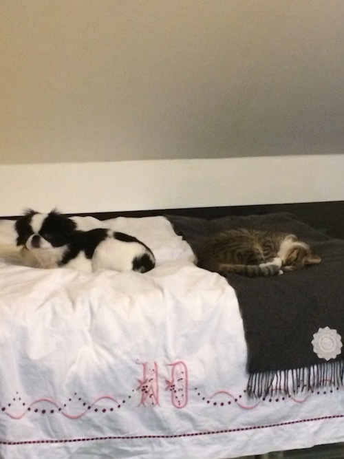 爪を出さない猫パンチと、尻尾を振りながらのガード攻撃で格闘する2匹。見ようによっては「仲良し」に見えなくもありませんが、2匹が一緒に「くっついて寝る」と言う姿にはまだまだ程遠いようです。。。