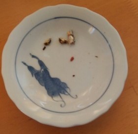 空のお皿には、煮干しの頭が残されています。お客様からは「嫌いなんですよねー、いつも残すんです」とのお返事。