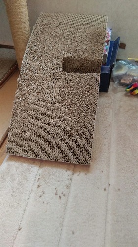 でも完食したお皿、立派なうんち、爪とぎあとの段ボールカス、トラコちゃんがいつも通りに過ごしている証拠です。