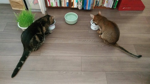 猫壱の食器で仲良く朝ごはん。いのちゃん(左)とたびちゃん(右)