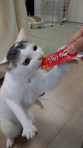 立ち上がってぺろぺろするマルコちゃん、ちゅーるのCMにでられそう!