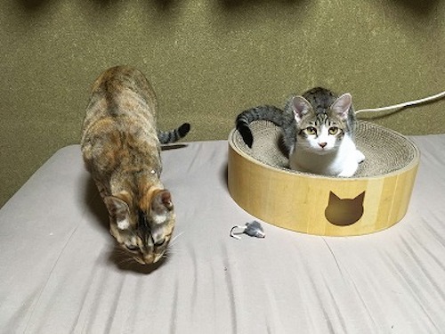 場所が場所なので、体をくねらせながら階段の垂直な側面部分でクネクネと爪を研ぐりんたろう。そのポーズの可愛さに、困った、と思いつつ、可愛い!と写真を撮ってしまう私。