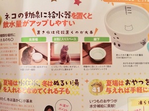 今回のネコDK、猫の健康を考えた様々なアイディアを紹介しています。「健康美猫になる、とっておきのフードケア」という特集の中で、やはり猫に水を飲ませるアイディアが色々紹介されていました。