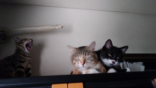 母猫は三毛柄、仔猫たちは白黒&キジトラです。猫の毛色のお話も奥深いのですがまた今度。