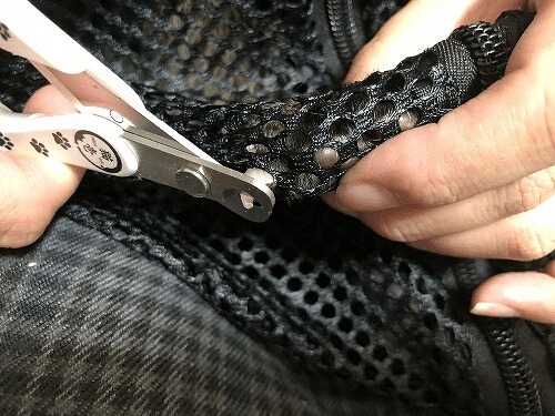 猫の肉球を優しく押して爪を出し、網の間から爪の部分だけを出します。
