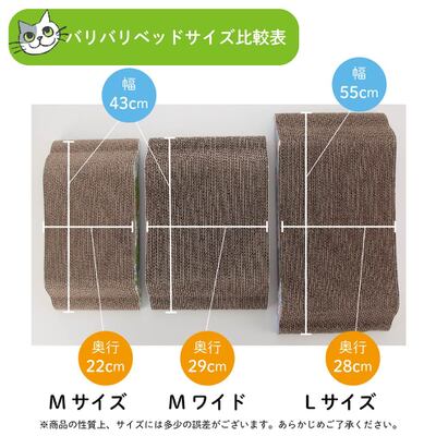 バリバリベッドのメリットは、どんな猫にも使いやすく、受け入れてもらいやすいことでそしょう。ベッドにして使うにしても、つめとぎするにしても、Mサイズ(花柄/猫柄)、Mサイズワイド、Lサイズ(花柄/猫柄/ダークブラウン)とサイズ展開があるので、大きめな猫ちゃんにも無理なく使ってもらえます。