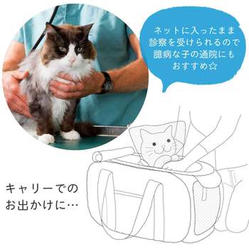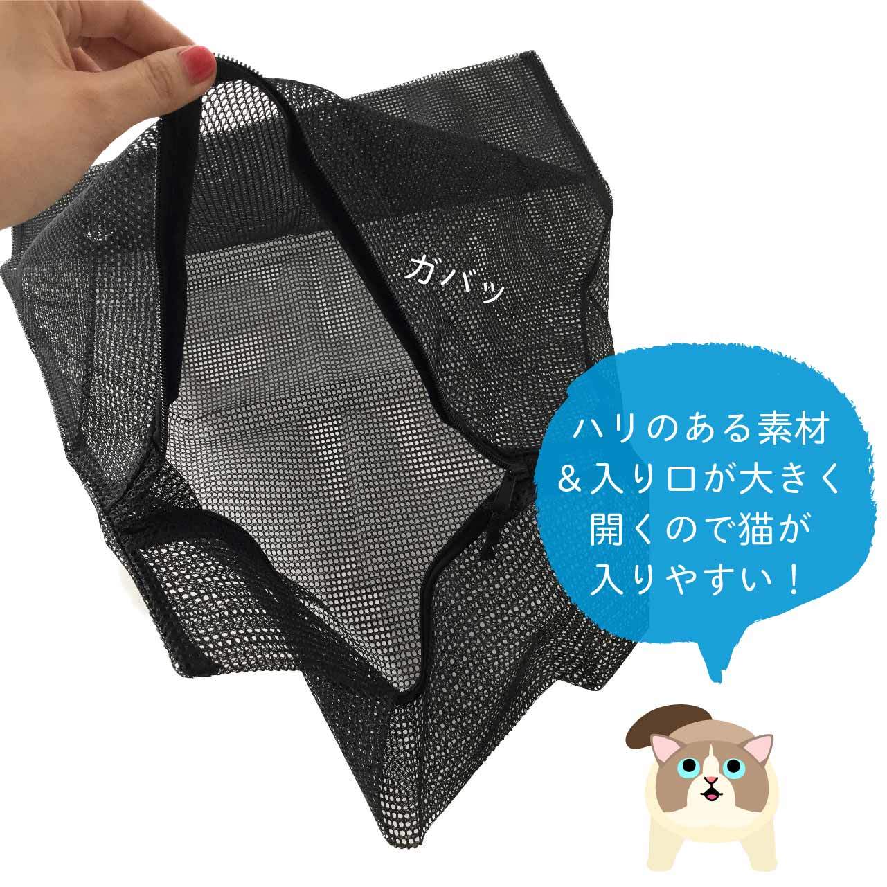 片手で開いても、ふにゃっと倒れてこないので、片手でネット、片手で猫ちゃん、と1人で対応しないといけない時も、比較的いれやすい生地感です。