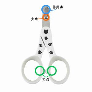 猫壱の爪切り、力を入れずともスパッと切れる、という特徴がありますが、ヒミツは「てこの原理」。「てこ」は、「支点」「力点」「作用点」の3つから構成されており、爪切りでは、それぞれ下記に該当します。