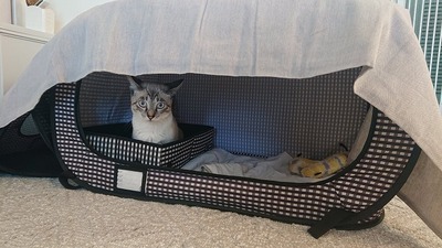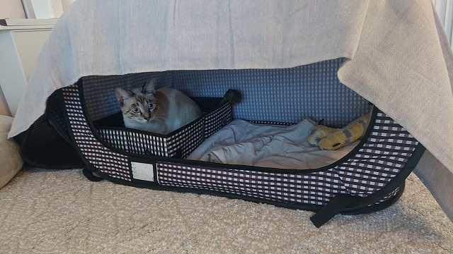 警戒心強めの愛猫ですが、ポータブルケージは中が薄暗くなり隠れ家感がでるのが気に入ったのか、中に入り浸るように…。