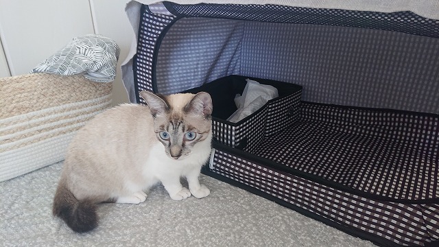 (ちなみにシーツがカゴ横から飛び出す長さで敷くと、ピロピロとでているシーツを噛み噛みしてました。