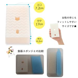 一般的な食器スポンジと比べてみると、タテはちょっぴり短め、横幅はほとんど変わらず、厚みは2倍ほど。
