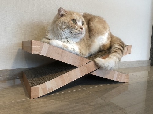 バリバリボードは本当にお気に入りで、何台リピート購入したかわかりません。ただし、ダンボール加工職人でもあるので、つめとぎ部分が無事でも、買い換えることもしばしば…。なんとか長持ちする縦型つめとぎが開発できないか、検討しているところです。