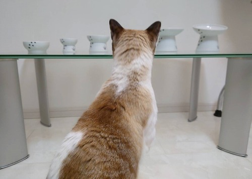 脚付フードボウル斜めタイプは、カリカリとウェット、あとお水をちょっと足してあげる時にも溢れず、こぼれずでお気に入り。