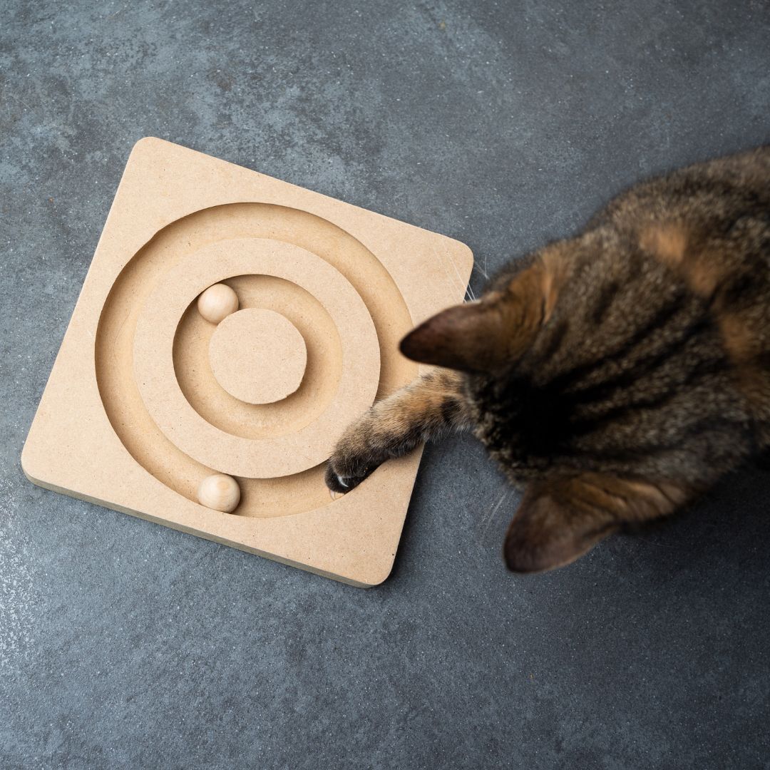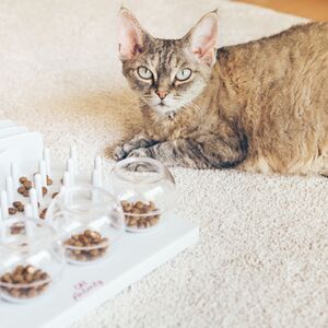 知育トイは知育玩具、パズルフィーダーなどとも言われています。おもちゃにフードを入れて、猫が工夫をしながらそのフードを出して攻略していくおもちゃです。