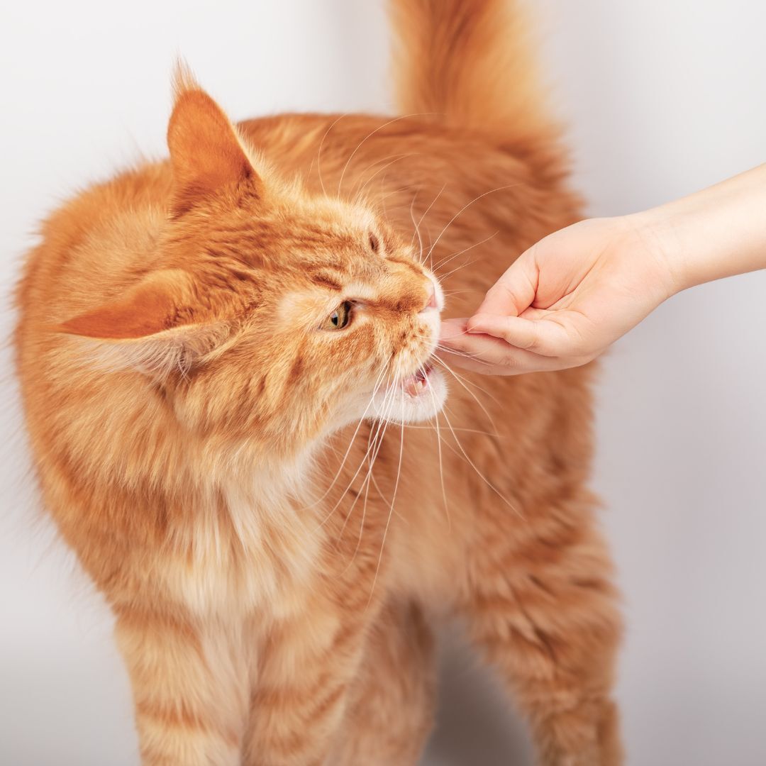 指先を猫に見せると自然によってきて鼻先を指にタッチするので、そのときに「いい子」と言ってからおやつを与えます(通常のドライフードを我が家は与えています)。