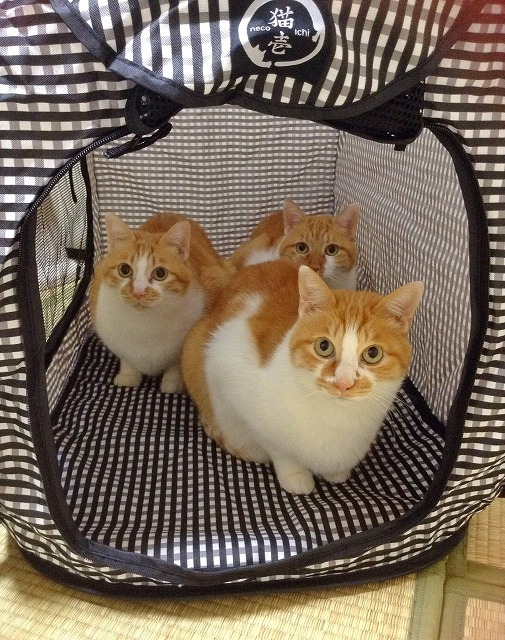 ポータブルケージを開くなり、猫たちが集まってきました。
