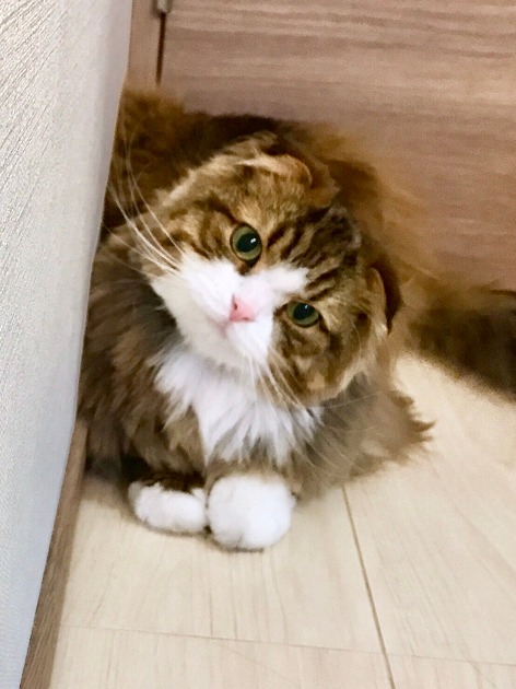 タレ耳とくつ下を履いたような模様が特徴のスコティッシュフォールドのマシロ君♂(2歳)です。生後3ヶ月のときに家に迎えた時から好奇心旺盛で食いしん坊な性格で、ご飯を作ってるとすぐキッチンに来て足元で甘えながらご飯をほしがります。