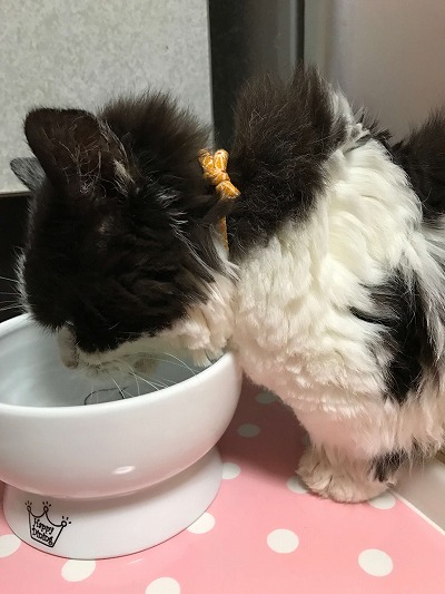 2年前に腎不全になりましたが、週一の点滴通院頑張っています。猫壱の器でお水いっぱい飲んでるにゃ。