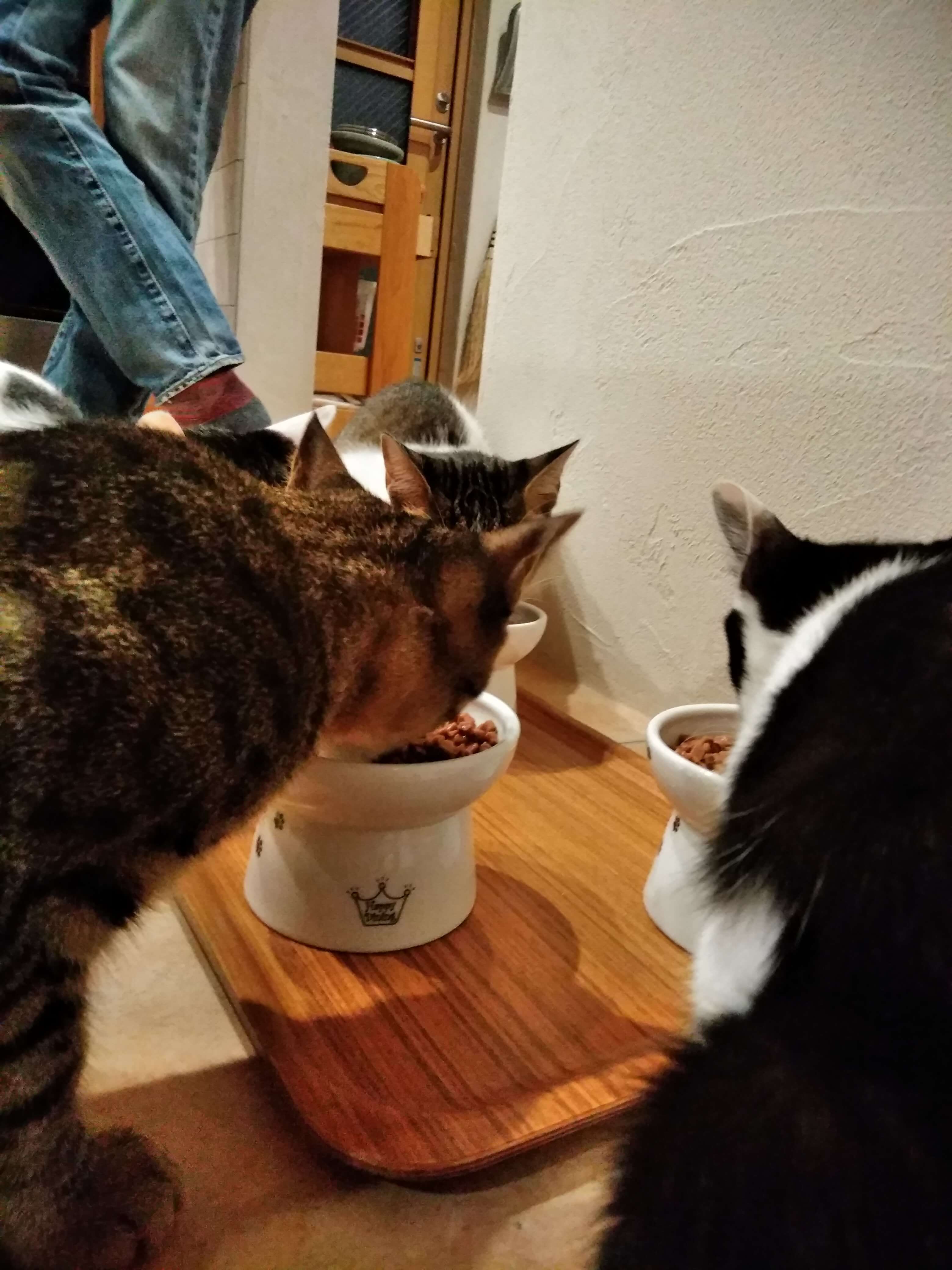 猫達が食べてるときの負担が減ったようです。食べているときの首も姿勢も楽そう。外に食べこぼすのモデル減ったようです。