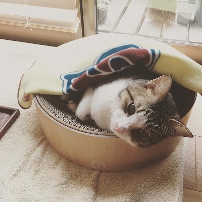 初めは頭を爪とぎボウルのヘリにのせていたけれど、おデブ化が進みついにはみ出がちに。
