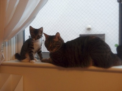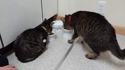 寝てばかりの先輩猫くうちゃんと、食いしん坊の子猫ねるちゃん。