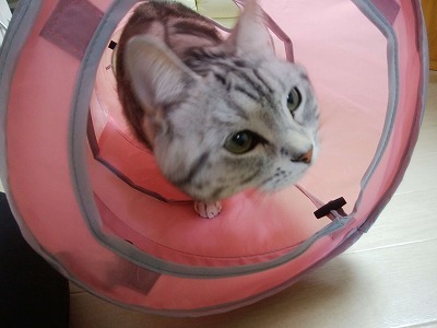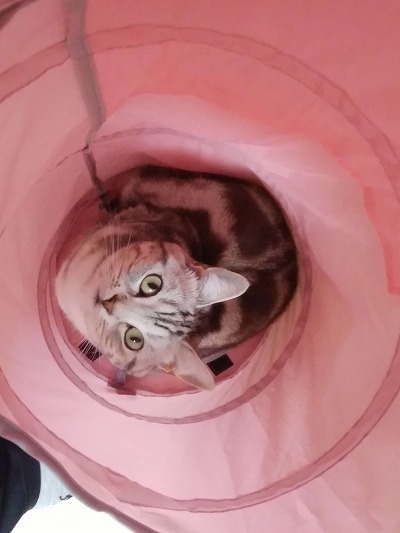 いつも楽しそうに遊んでいます。途中に開いている穴からもぴょこっと顔を出しておもちゃにじゃれる姿もあります。