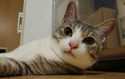 性格はお転婆。元気いっぱい。食べ物も好き嫌いなし。チャームポイントは前足の左右、後ろ足の左右で模様が違います。