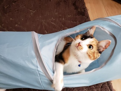 トンネルの中に猫じゃらしを入れてじゃれさせたり、狭いのが好きなので、いつのまにかトンネルの中で寝ちゃってる事もあります。