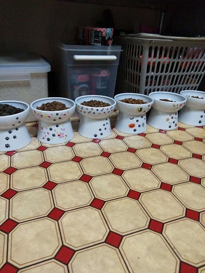 大きい方が良いと思いウオーターボウル、パウチや缶詰は脚付きレギュラーサイズを使っていたのですが、