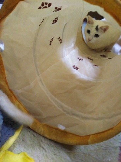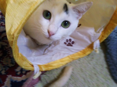 慎重で人見知り、猫見知りがはげしい。幼い頃骨盤骨折していてジャンプ はあまり得意じゃない為キャットタワーよりトンネルが気に入ったみたい。