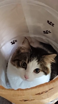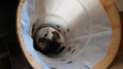 私が休みの日、トイレに起きてしまった朝の5時代と言う早朝に、トイレから戻ってきたら、私が寝ている間は立ててあったキャットトンネルに、おうちの様に入ってました。