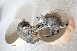 爪とぎはもちろん、夜の寝床に昼の寝床に、2匹のじゃれ合う土俵にと大活躍。軽くて丈夫なので重宝しています。