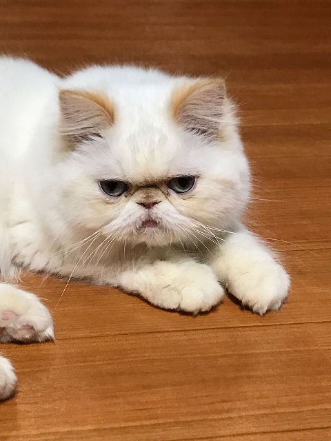明るくものおじしない元気な女の子です。白いモフモフのコートに青い目。お鼻はぺちゃんこですが可愛い子です。