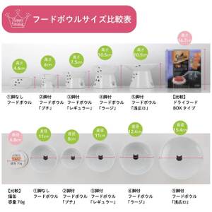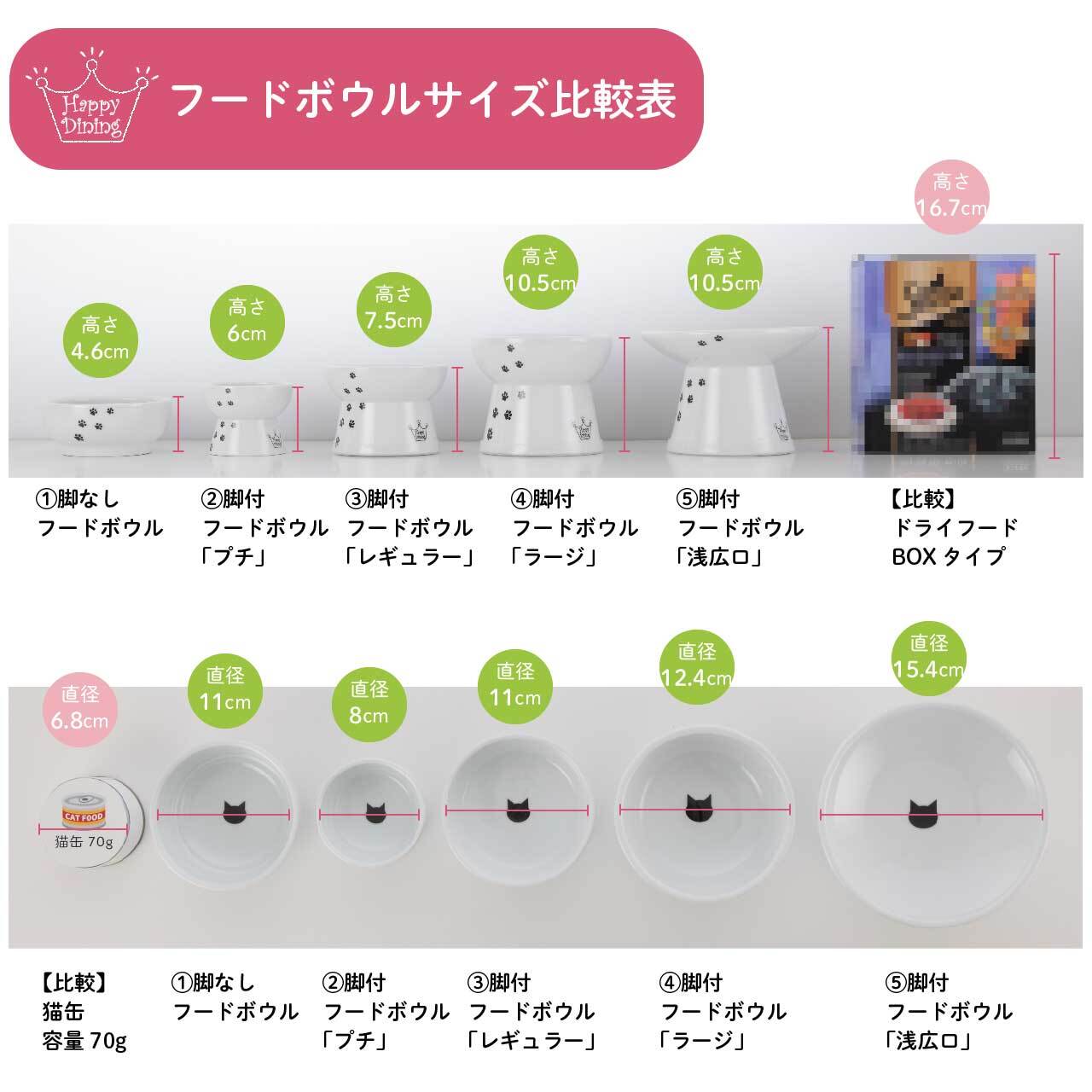 猫用フードボウルは脚なしフードボウルの他に、脚付フードボウル3サイズ(プチ・レギュラー・ラージ)、そして「浅広口タイプ」「斜めタイプ」の2種類の形状、計6種類から猫ちゃんの体格や好みに合わせてお選びいただけます。