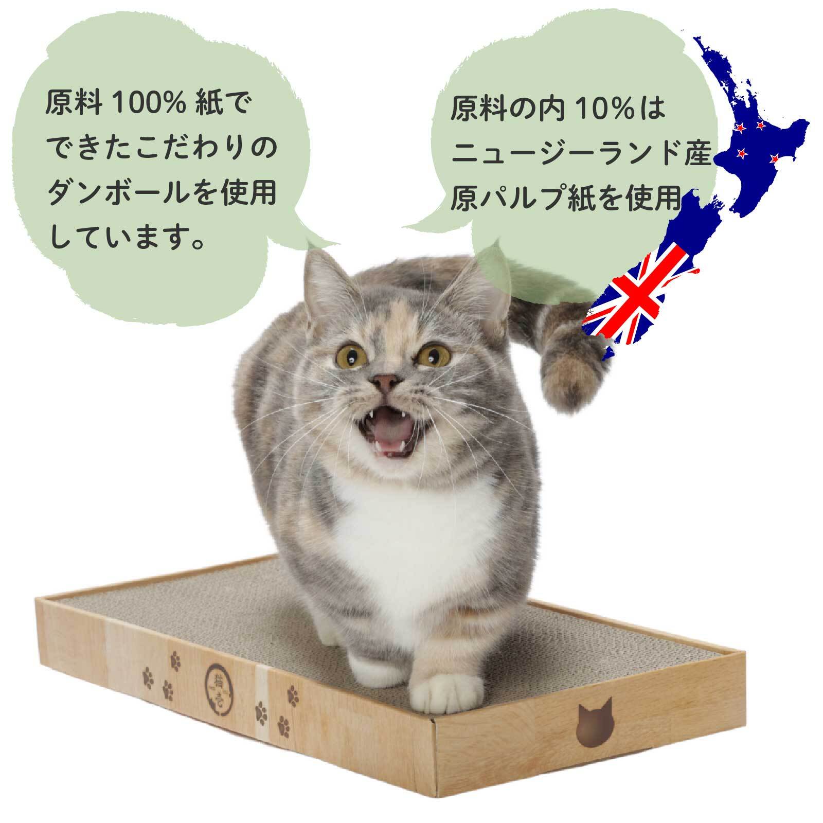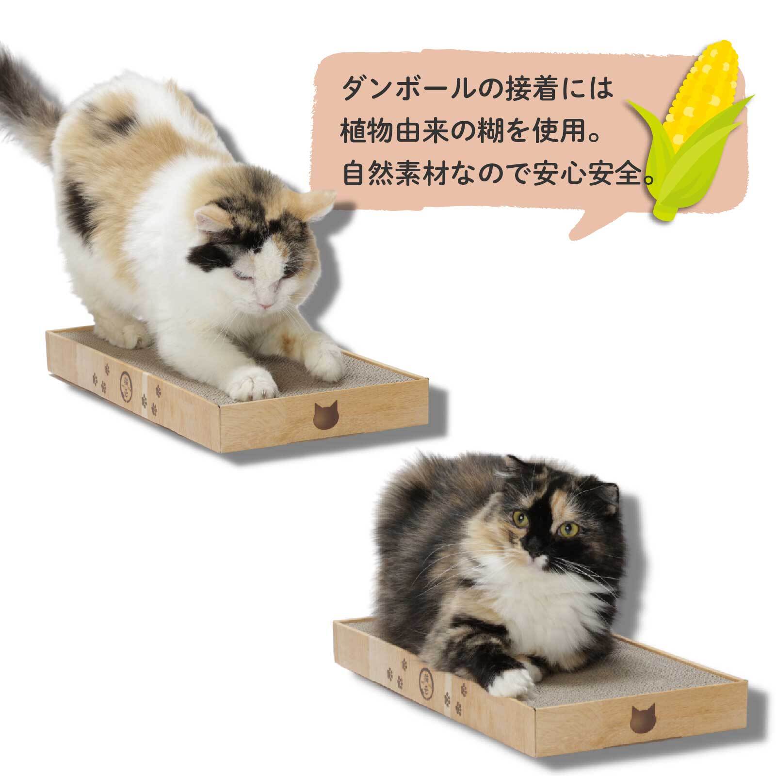 猫ちゃんのカラダが直接触れるつめとぎベッド。つめとぎ後のカスがカラダに付着することを考慮して、つめとぎダンボール部分の接着には化学素材の糊を使用せず、植物由来の糊を使用しています。