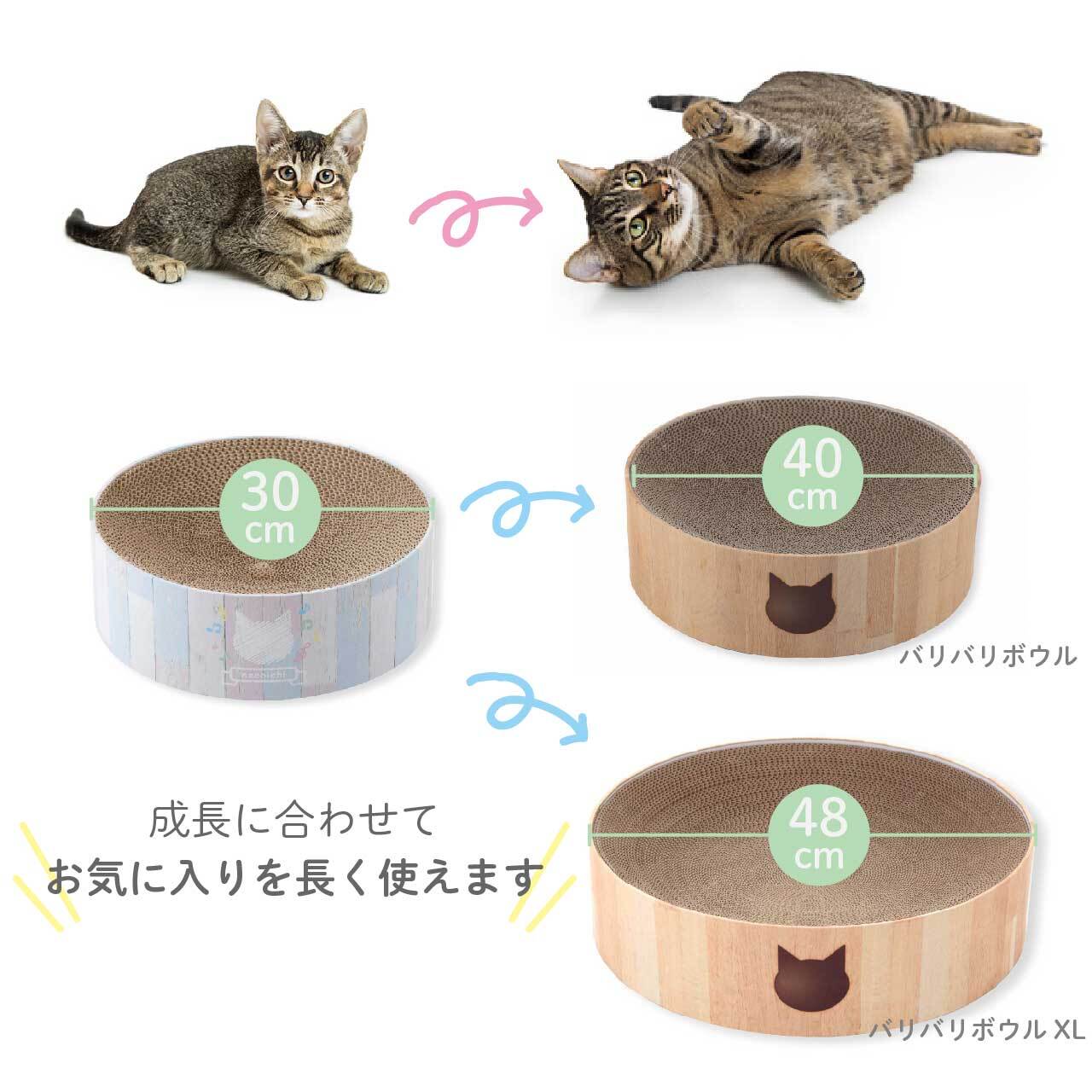 バリバリボウルは直径30cmの子猫用、直径40cmのレギュラーサイズ、直径48cmのXLサイズの3サイズ展開です。