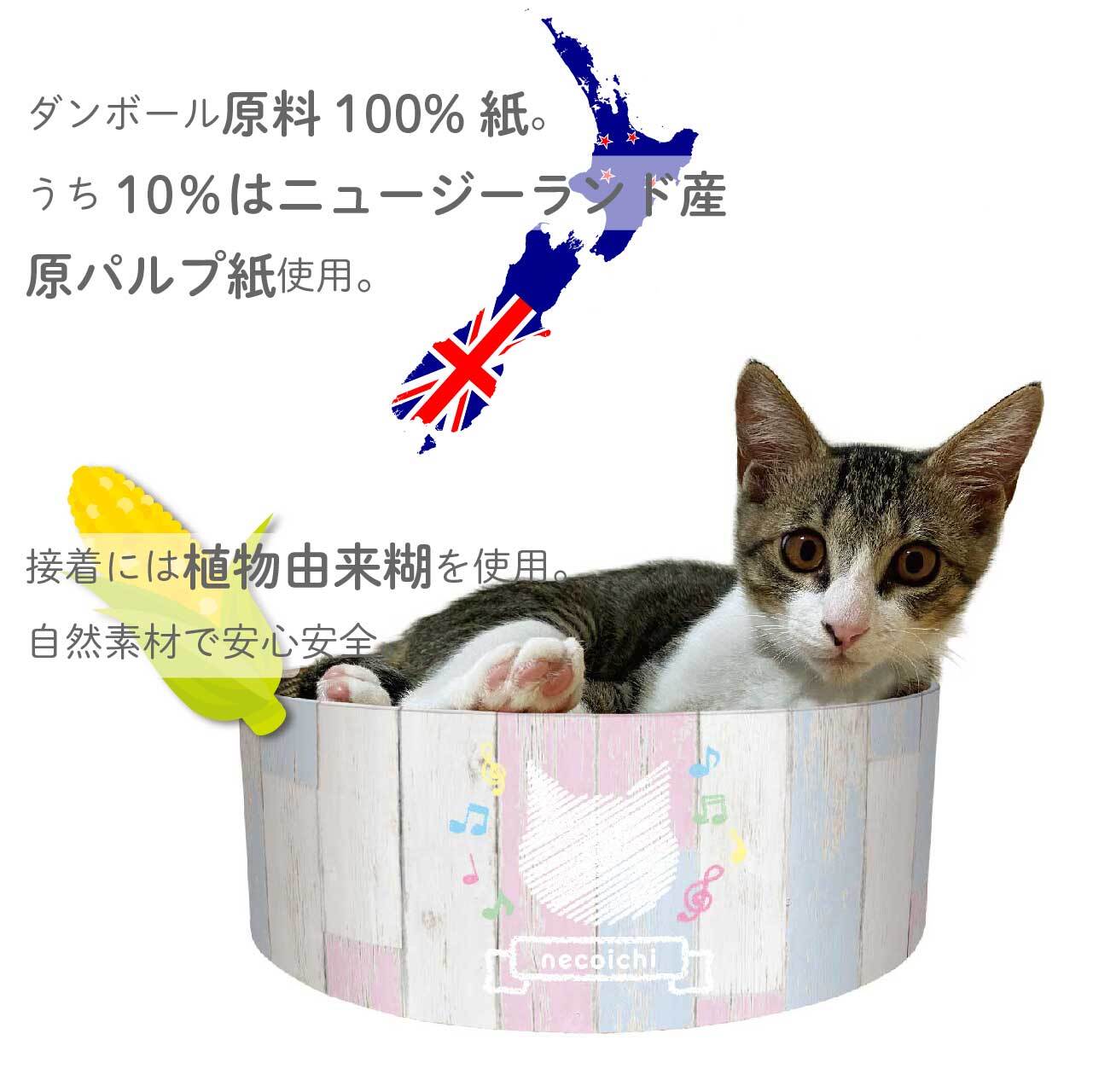 猫ちゃんのカラダが直接触れるつめとぎベッド。つめとぎ後のカスがカラダに付着することを考慮して、つめとぎダンボール部分の接着には化学素材の糊を使用せず、植物由来の糊を使用しています。
