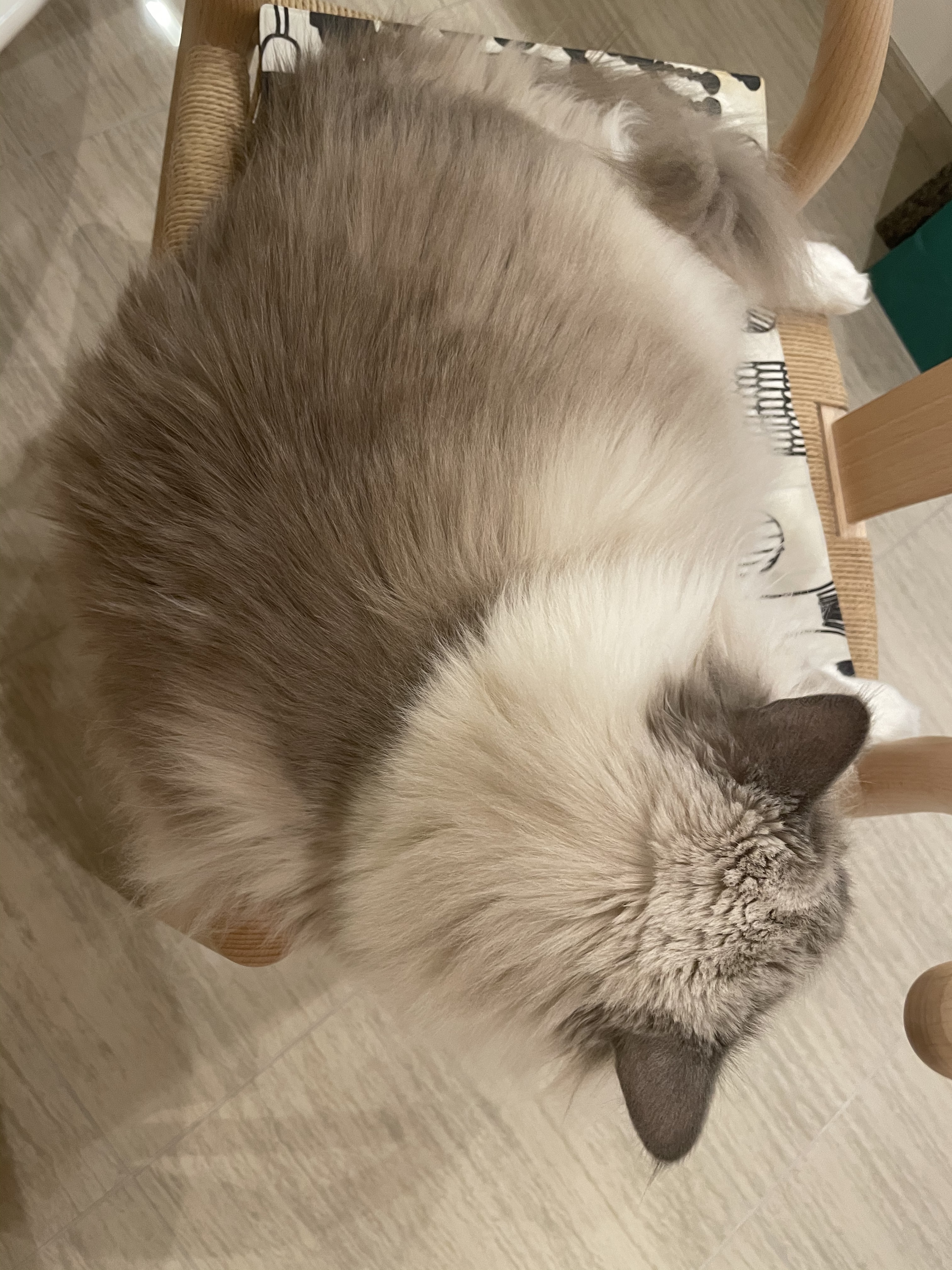 長毛種猫ちゃんなので、ブラッシングは特に必須なのですが、ブラッシングが大の苦手でときに毛玉に…。