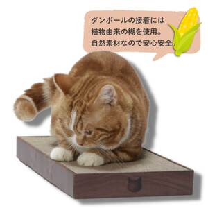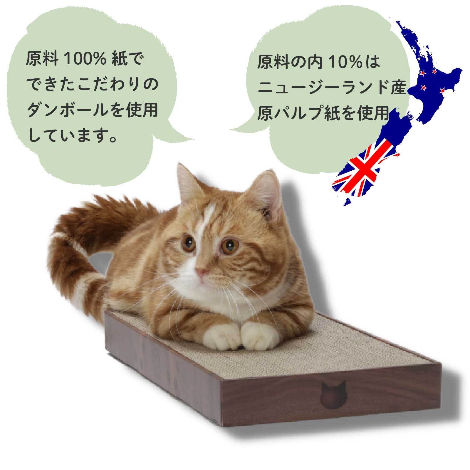 猫ちゃんのカラダが直接触れるつめとぎベッド。つめとぎ後のカスがカラダに付着することを考慮して、つめとぎダンボール部分の接着には化学素材の糊を使用せず、植物由来の糊を使用しています。