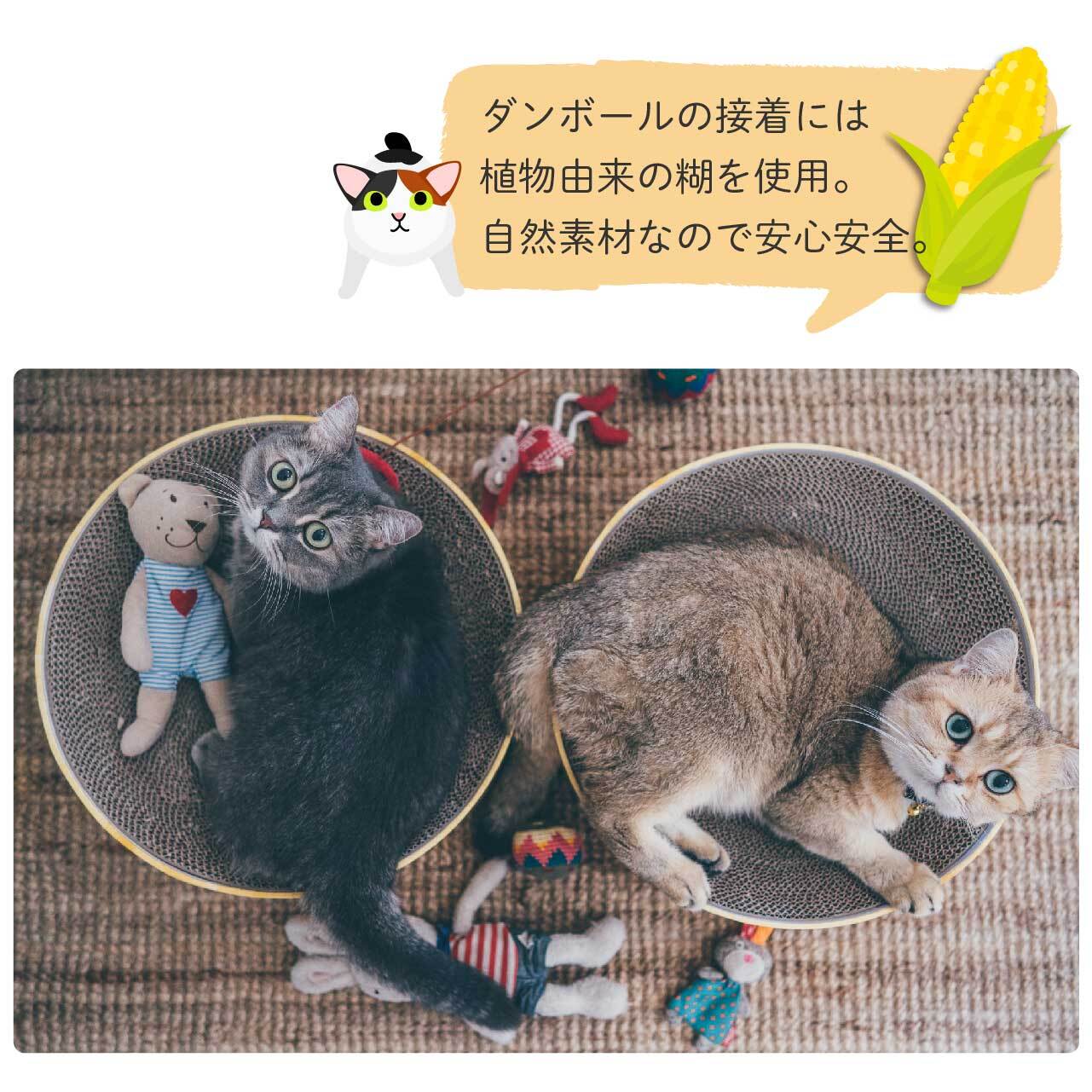 つめとぎ後のカスがカラダに付着することを考慮して、つめとぎダンボール部分の接着には化学素材の糊を使用せず、植物由来の糊を使用しています。