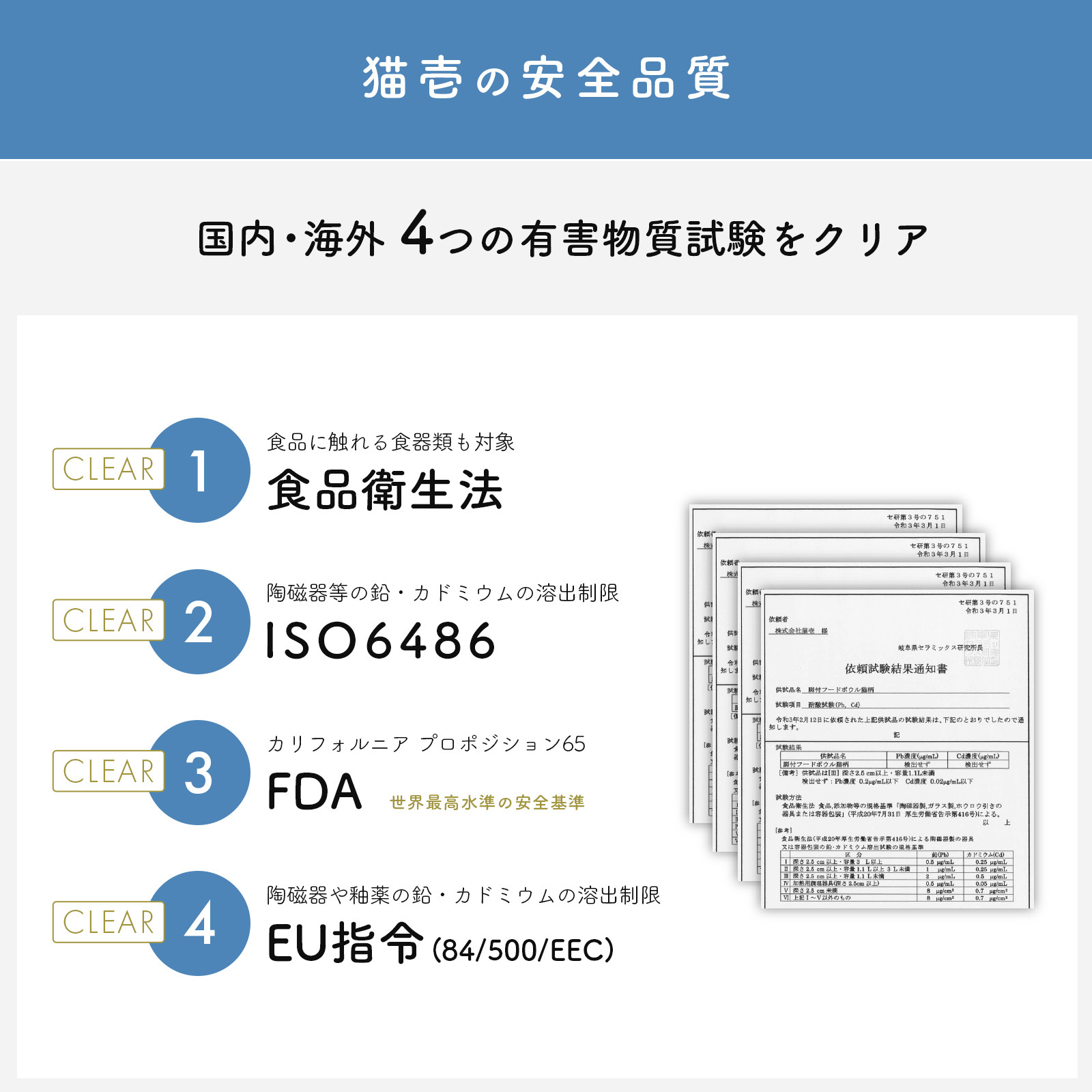 猫壱のハッピーダイニングシリーズは国内/海外4つ※有害物質試験をクリアした「鉛・カドミウムフリー」食器です。