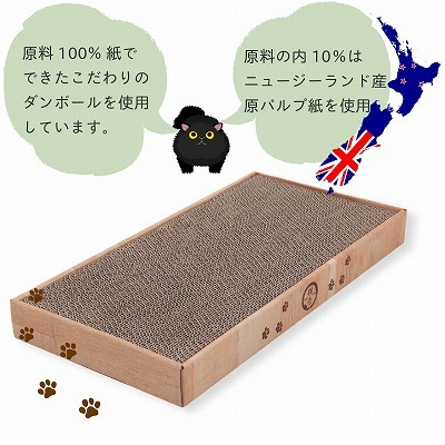 猫ちゃんのカラダが直接触れるつめとぎベッド。つめとぎ後のカスがカラダに付着することを考慮して、つめとぎダンボール部分の接着には化学素材の糊を使用せず、植物由来の糊を使用しています。