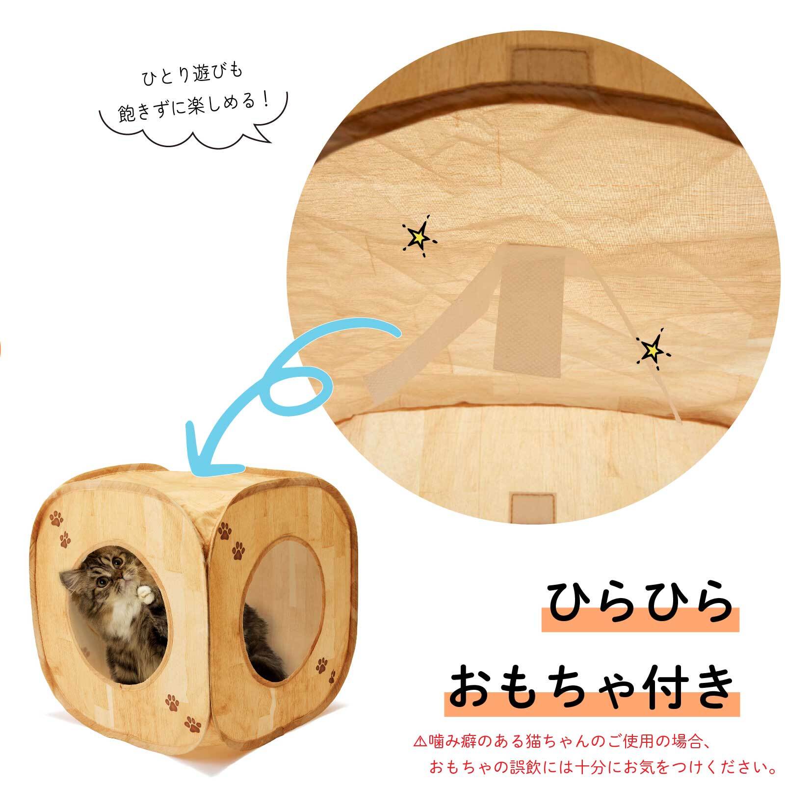 キューブ内側の天井には、猫の遊び心をくすぐる、布製のひらひらのおもちゃがついています。