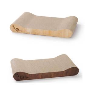 1枚板タイプはつめとぎの背板に折り目がなく1枚のダンボール板仕様になりますが、2つ折りタイプはつめとぎの背板中央に割れ目があり粘着テープでくっつけて立たせる仕様になります。