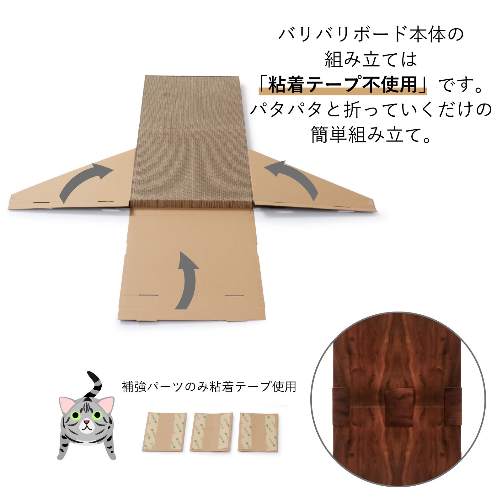 2つ折りになった背板部分のつめとぎを合わせるのに使用する粘着テープは強力タイプを使用することで、しっかりと補強します。