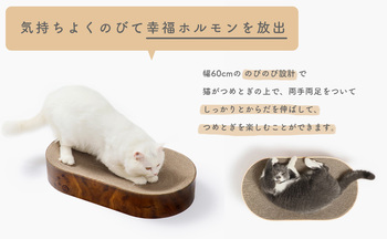 幅60cmののびのび設計なので、猫がつめとぎの上で、両手両足をついてしっかりとからだを伸ばして、つめとぎを楽しむことができます。